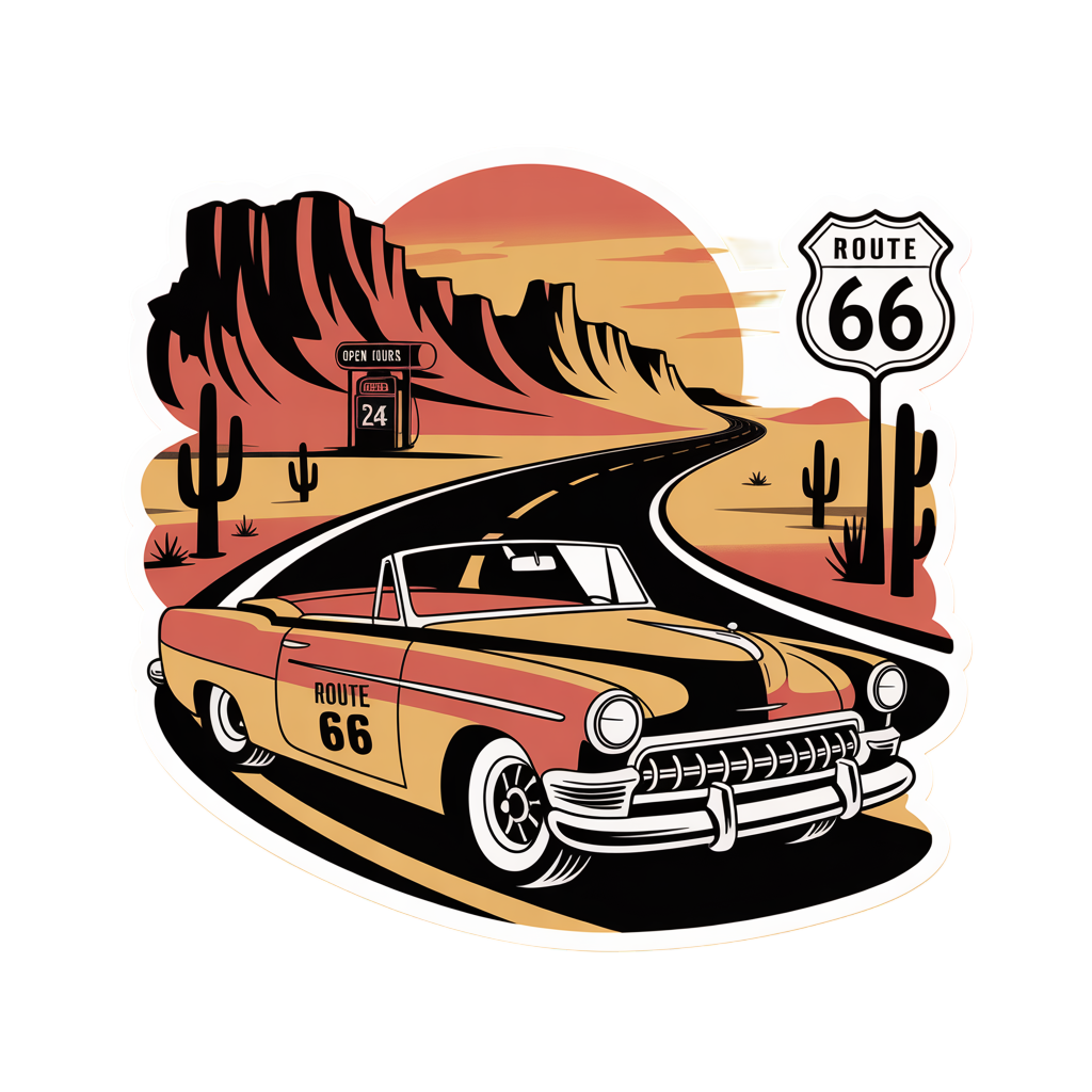 A vibrant, stylized illustration depicting a classic convertible car driving down the iconic Route 66 through a desert landscape at sunset. The scene features prominent desert mountains, cacti, a vintage gas pump with "Open 24 Hours" and "Diesel 24" visible, and the recognizable Route 66 shield sign. The art style evokes a nostalgic, retro travel poster feel.