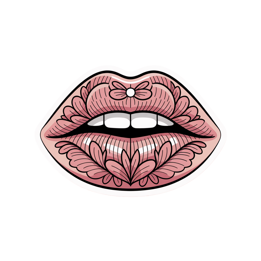 Description: An artistic illustration featuring a pair of pink lips with intricate floral and leaf patterns integrated into their design. A small flower with a pearl-like center is depicted on the Cupid's bow. The artwork has a clean white outline against a solid black background.