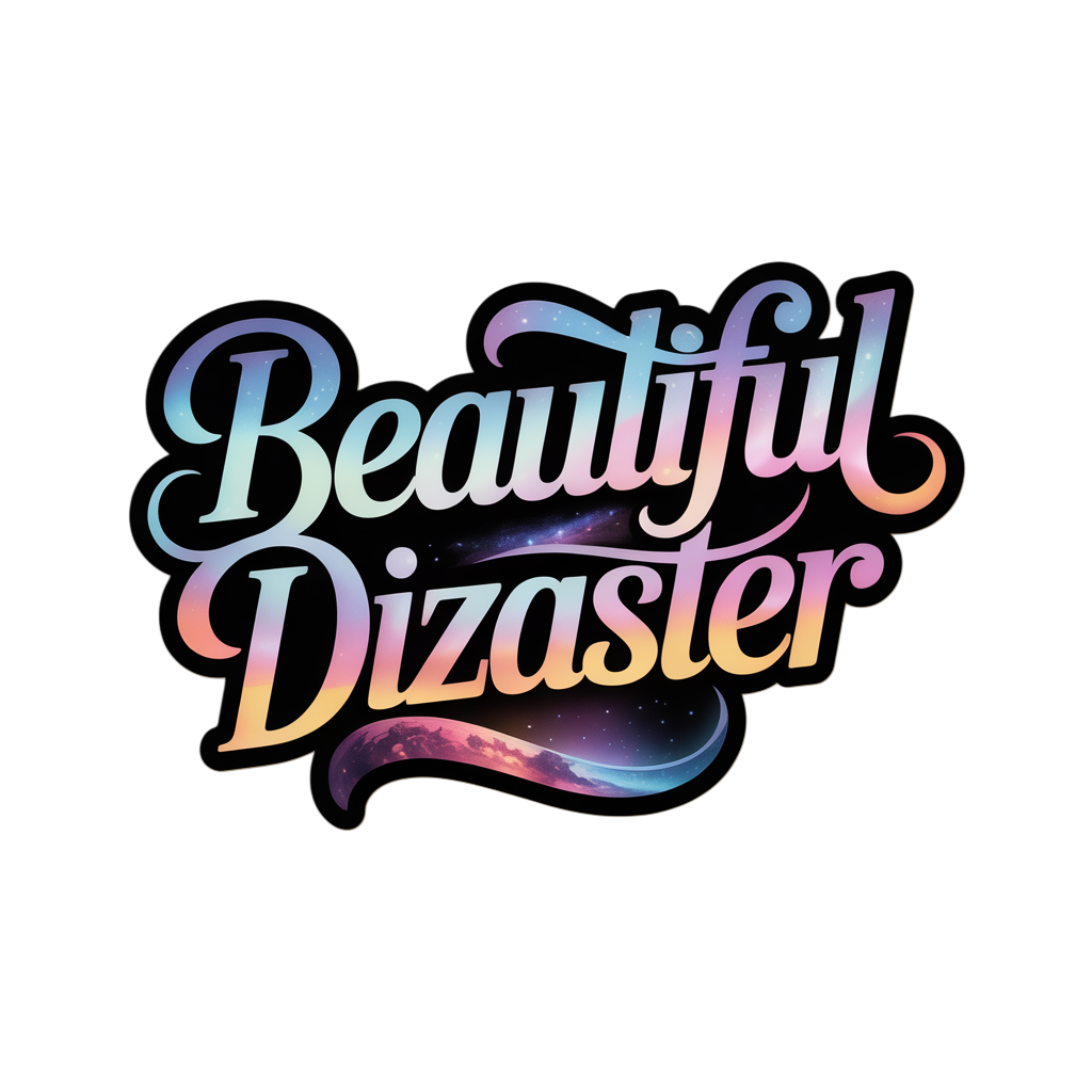 logo featuring the words "Beautiful Dizaster" in a stylized, script-like font with a subtle outline. The text is set against a dark background with a sunburst or radial line pattern emanating from behind.